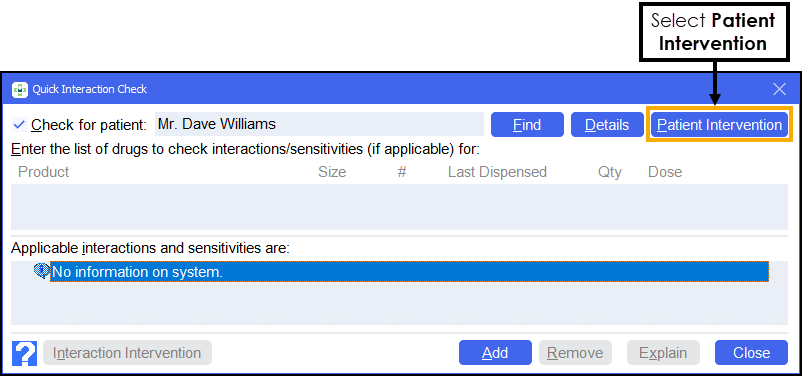 Quick Actions - Quick Interaction Check, select Patient Intervention. See Starting a Patient Intervention from the Quick Interaction Check screen for details.