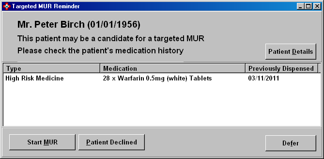 When a script is issued from the dispensary tab, a check will be made to see if the patient is eligible for a targeted MUR.