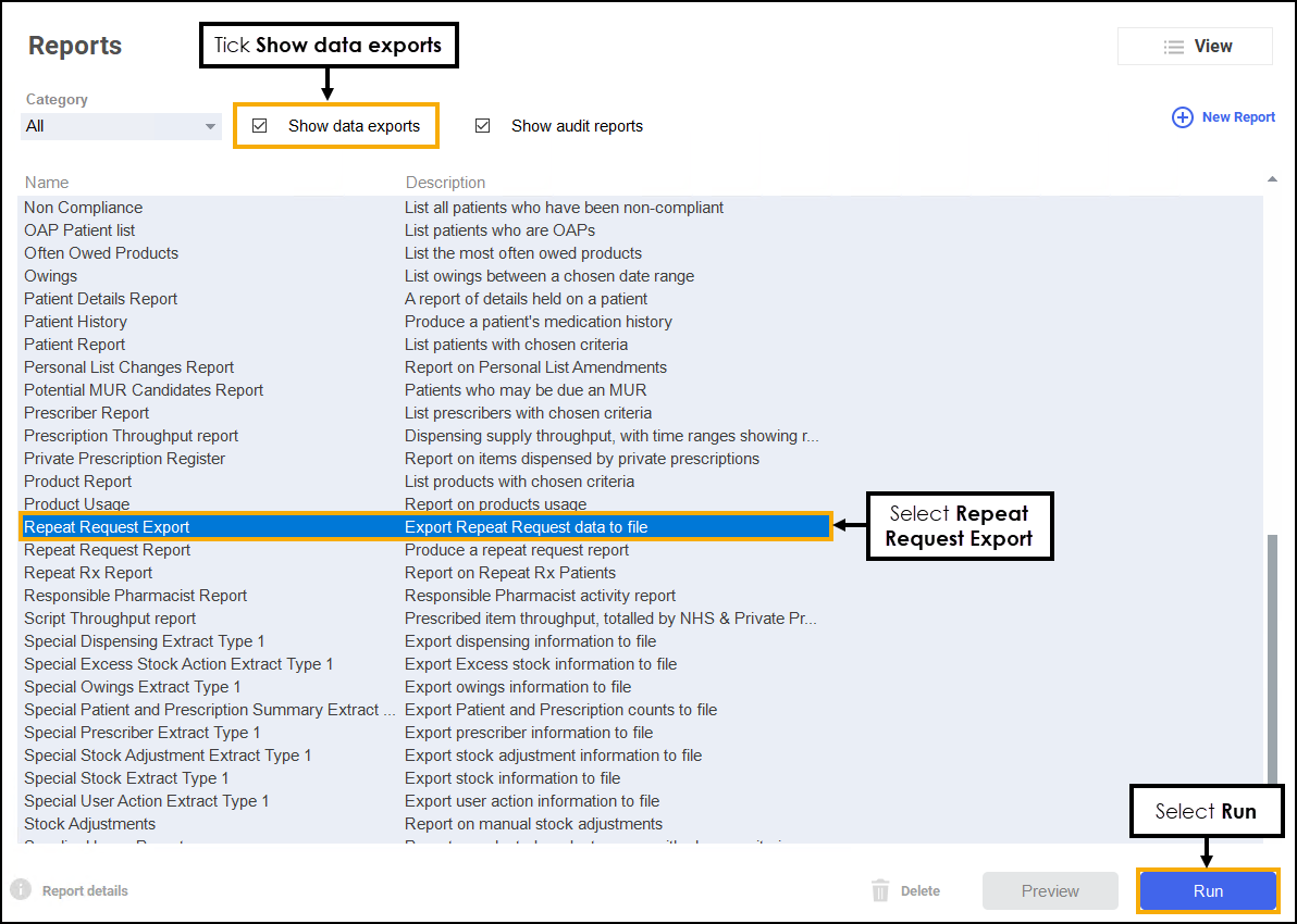 .The Repeat Request Export is saved to your selected directory, containing all repeat requests that have been emailed or printed by the pharmacy. The report contains: