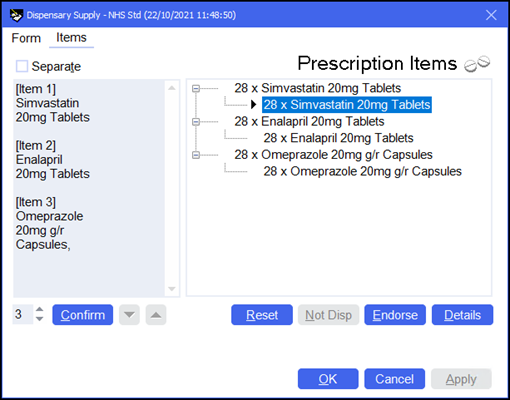 - Once a prescription is complete, providing you have set the Endorsement printing option to Always in User Details, the Dispensary Supply screen displays.