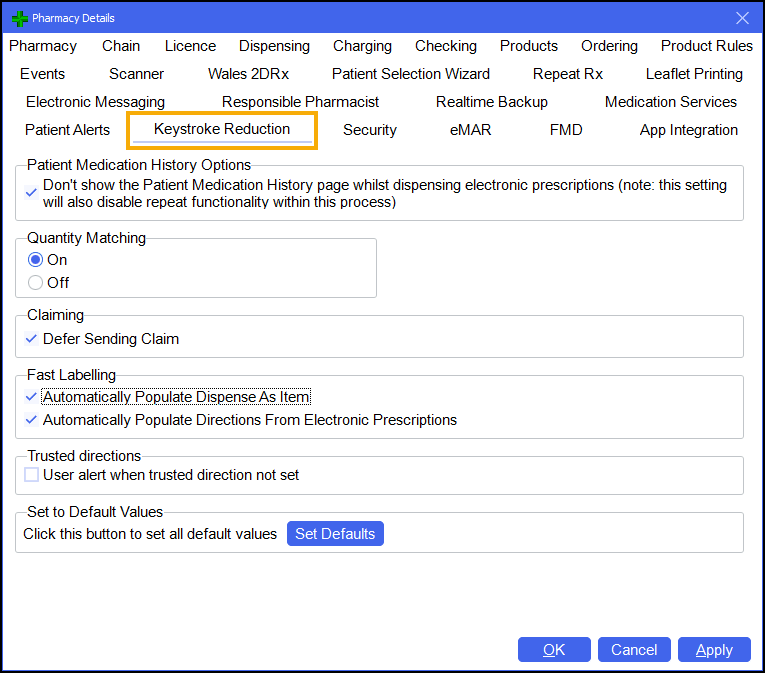 From the Pharmacy Manager Toolbar, select Tools - System Settings - Pharmacy Details and then select the Keystroke Reduction tab: