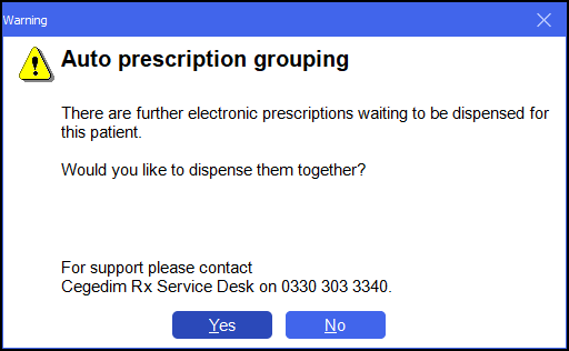 If you have Prescription Grouping enabled and you have missed a prescription for the patient, a warning displays advising 'There are further electronic prescriptions waiting to be dispensed for this patient':