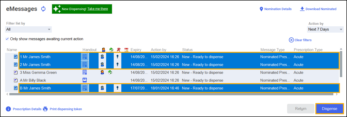 To dispense multiple prescriptions for the same patient, press and hold Ctrl on your keyboard select each prescription and then select Dispense