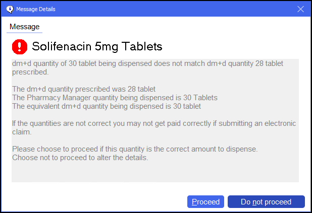 A 'dm+d quantity of nn tablet being dispensed does not match dm+d quantity nn tablet prescribed' message displays.