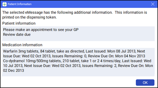 Training Tip - You can scan the prescription to highlight the correct patient/prescription. - The Patient Information screen displays, showing any notes added by the GP. Select OK