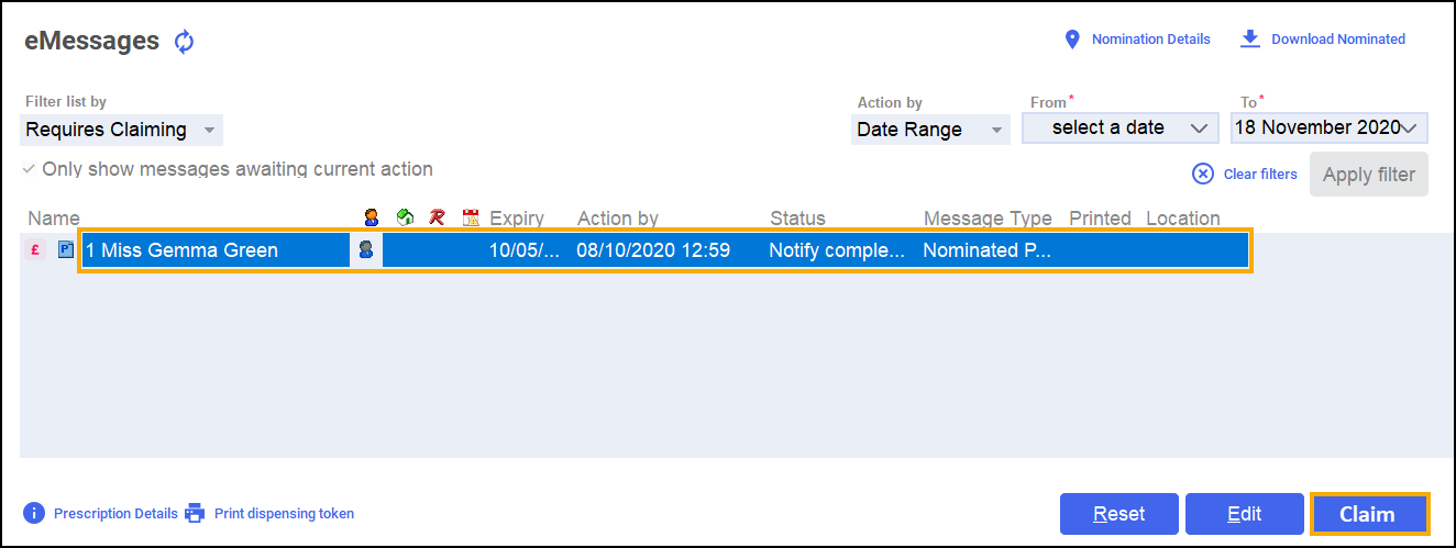 - Highlight the required prescription and select Claim