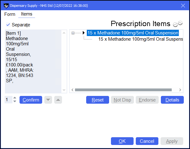 . - The Dispensary Supply screen displays. Check the endorsement details are correct for the item and select Confirm