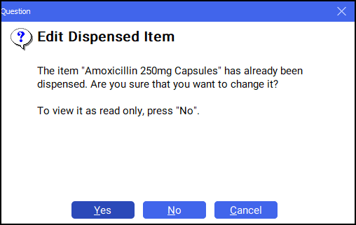 - A question displays 'The item "Item Details" has already been dispensed. Are you sure that you want to change it? To view it as read only, press "No".':