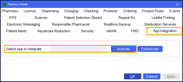 From the Pharmacy Manager Toolbar, select Tools - System Settings - Pharmacy Details, select the App Integration tab: