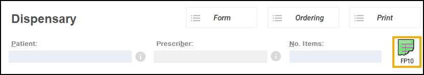. The Dispensary screen displays. - Change the prescription type by double clicking on FP10