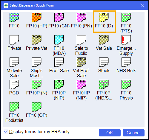 - The Select Dispensary Supply form displays. Select FP10 (D)