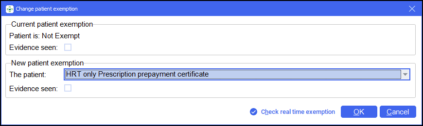 The Change patient exemption screen displays, select HRT only Prescription prepayment certificate from the available list.