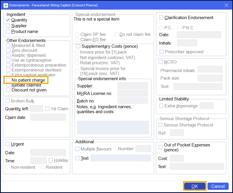 Select No patient charge and then OK