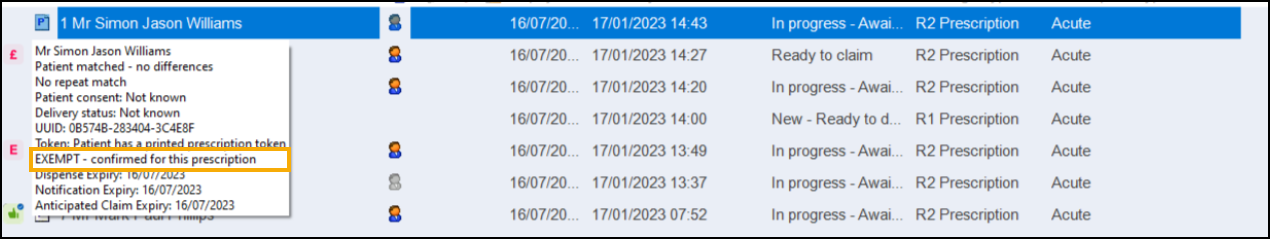 Please note - Form exemptions do not display on the eMessages screen however if you hover over the patient, a tooltip displays with the exemption details.