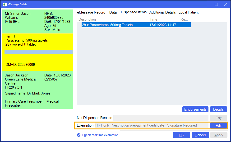 From the Dispensary screen, during dispense, double click the warning 'Patient is not exempt - Signature Required'.