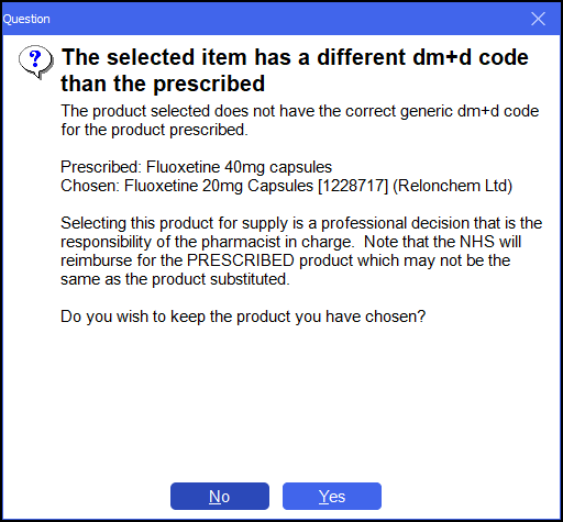 Note - In the above example, the electronic prescription is for Fluoxetine 40mg capsules, however due to an SSP, the pharmacist is dispensing double the amount of Fluoxetine 20mg capsules.If the medication item does not match the prescribed item, the Question screen displays, informing you that 'The selected item has a different dm+d code than the prescribed item'. Select Yes to proceed: