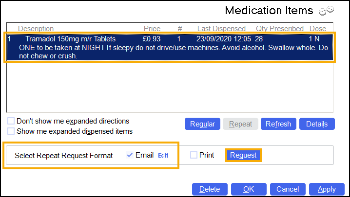 From Medication Items, select the item you wish to request the repeat prescription for: