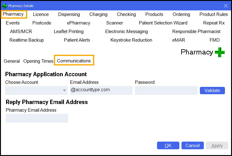 - The Pharmacy Details screen displays. From the Pharmacy tab select the Communications tab: