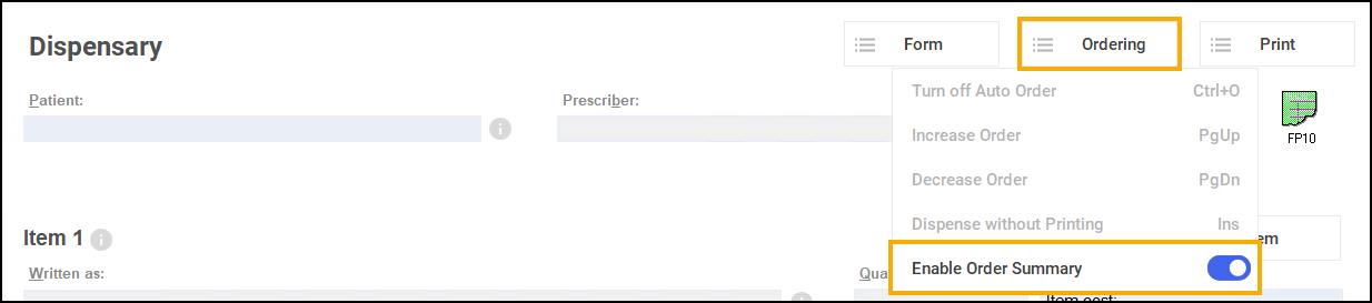 From the Dispensary screen, select the Ordering menu and switch on Enable Order Summary.