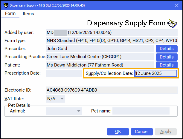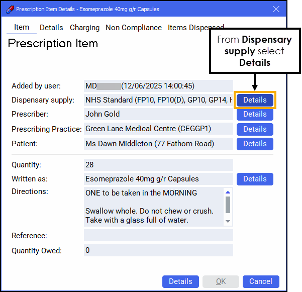 The Prescription Item Details screen displays, from Dispensary supply, select Details to display the Dispensary Supply screen and the Suuply/Collection Date of the item.
