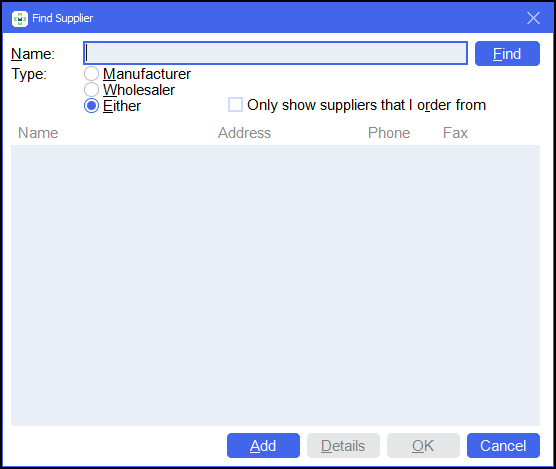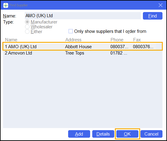 Note - If the required supplier does not display in the list, make sure that you select Either as the Type and remove the tick from Only show suppliers that I order from. -
