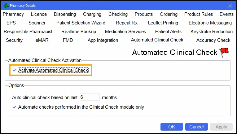 The configuration setting for Auto Clinical Check is in Tools - System Setting - Pharmacy Details - Automated Clinical Check.