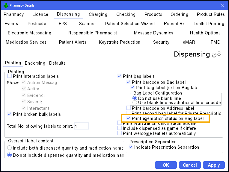 From Pharmacy Details - Dispensing - Printing, tick Print exception status on Bag label.