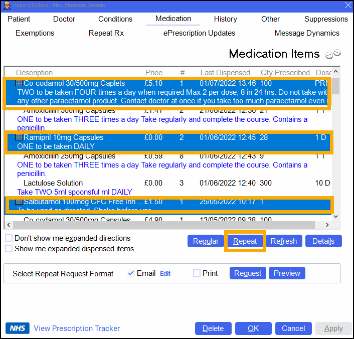 When you choose to dispense from the patient's history, all items marked as regular will be highlighted and when you select Repeat
