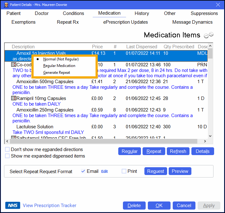 Regular items (as opposed to one-off items) are those that the patient will receive each month/ prescription period. Highlight an item, right click and select either Normal, Regular or Generate Repeat.