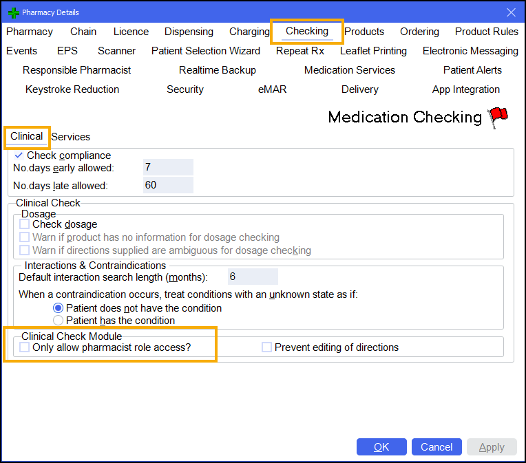 In Clinical Check Module place a tick next to Only allow pharmacist role access?.