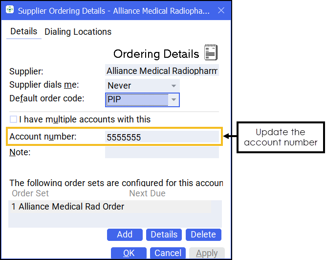 The Supplier Ordering Details screen displays. Update the account number as required.