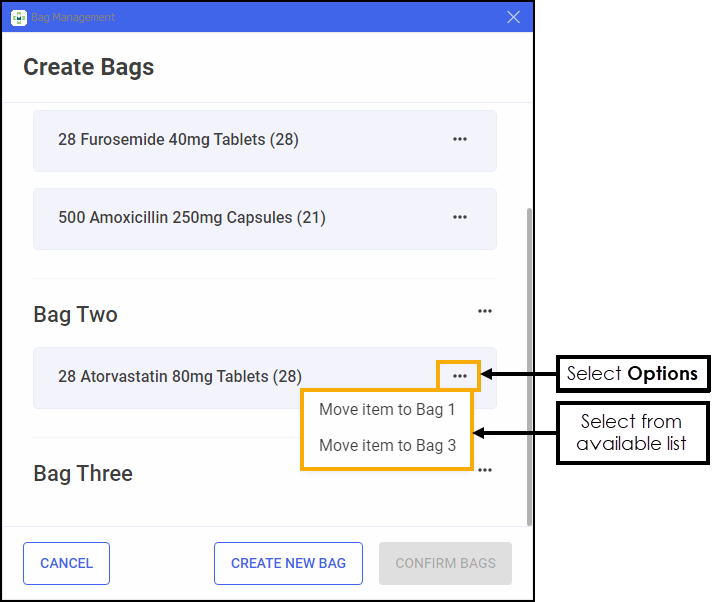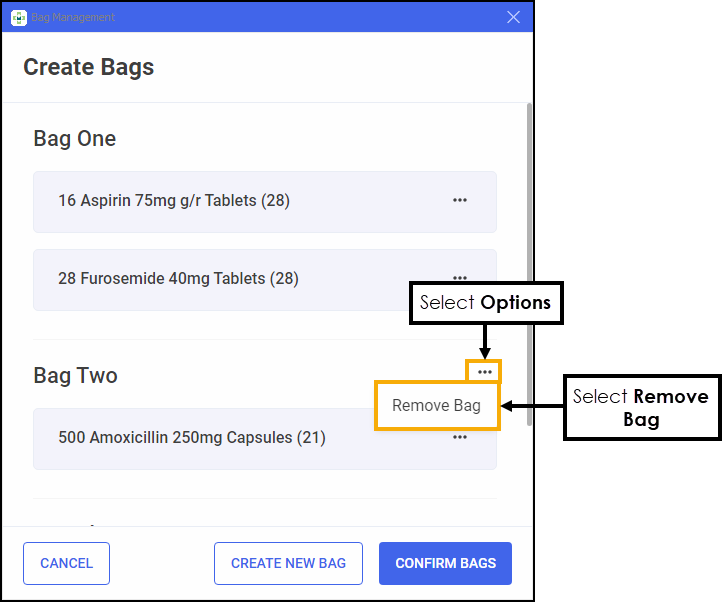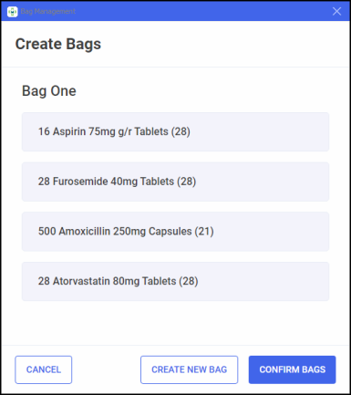 CONFIRM BAGS - To confirm the current bags are correct, this is unavailable if there are bags with no items assigned. The bag labels print for this prescription.