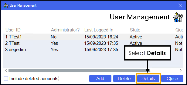- The User Management screen displays, highlight a user and select Details.