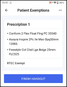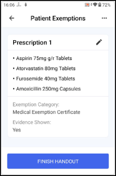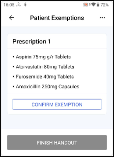 If the exemption is eligible for Real Time Exemption Checking (RTEC), or the patient is age-exempt, the exemption is automatically selected and you can select FINISH HANDOUT