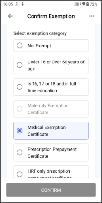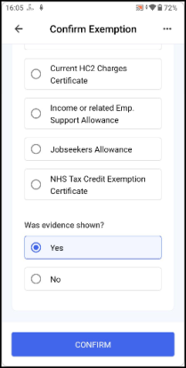 Select the correct exemption category from the list and if the evidence was provided. Select CONFIRM