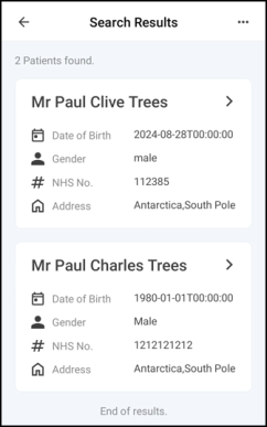 The Search Results screen displays matching patients that have a bag awaiting handout or is awaiting to be assigned a shelf, select to confirm the correct patient.