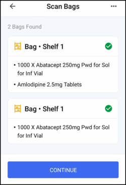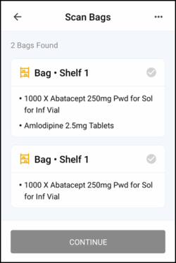 .Note - You cannot select CONTINUE until all bags are scanned.Note - If you leave this screen and return, you must scan the bags again.