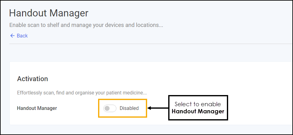 The Handout Manager screen displays. In Activation, select Handout Manager to enable the feature.