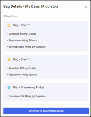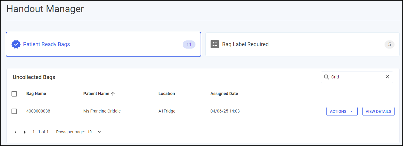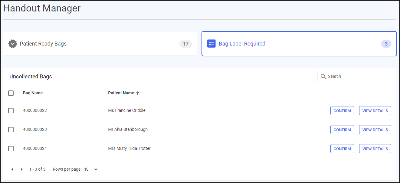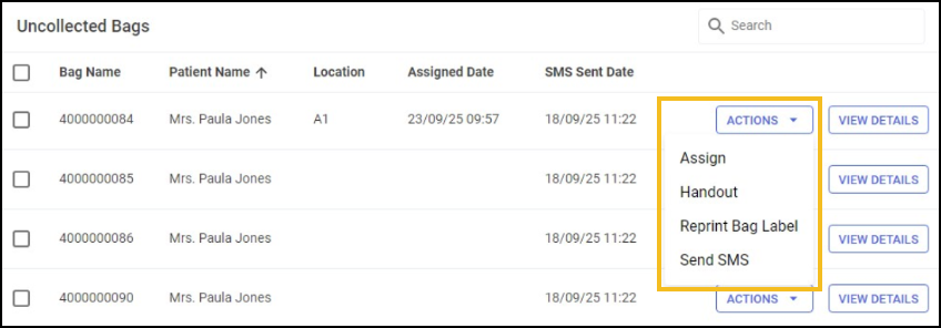 • VIEW DETAILS - Select to view the bag details, this displays the bag ID, the patient's name, and the details of prescriptions within the bag.
