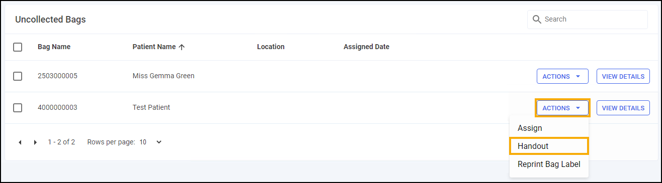 1. From the Uncollected Bags screen, select ACTIONS - Handout.