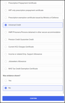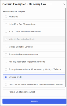 2. Select the correct exemption category from the list and if the evidence was provided. Select CONFIRM to continue.