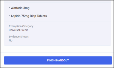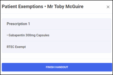 • If the exemption is eligible for Real Time Exemption Checking (RTEC), the patient is exempt you are advised that they are RTEC Exempt, select FINISH HANDOUT .