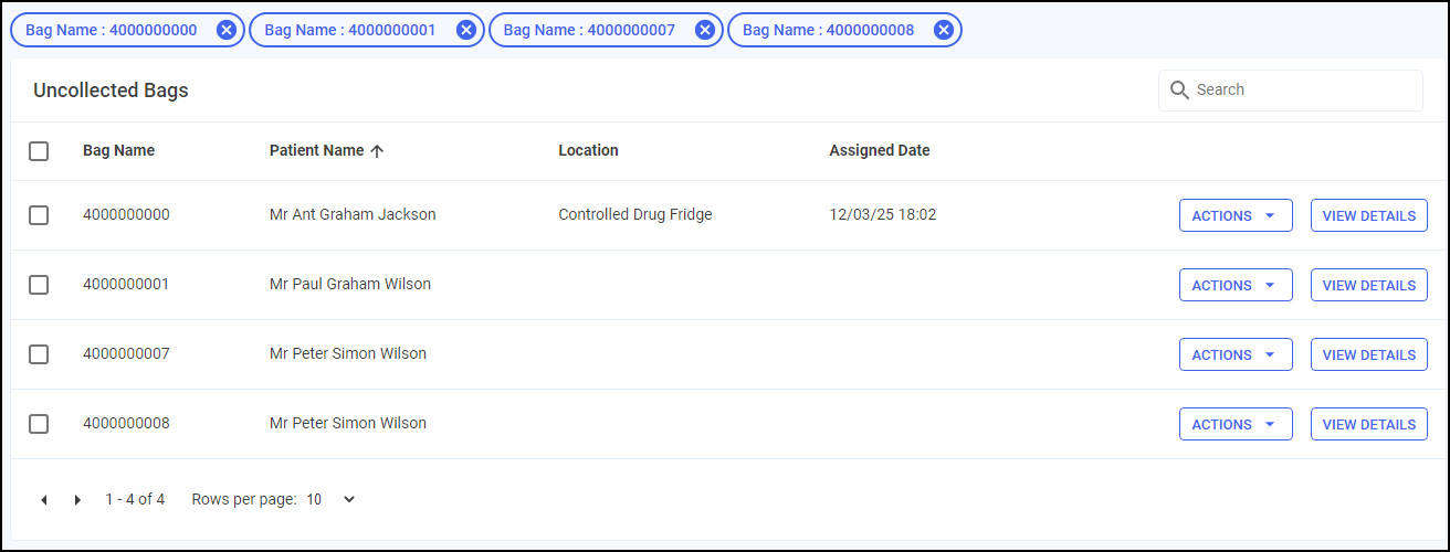 The Uncollected Bags screen displays your uncollected bags within Pharmacy Manager whether assigned to a location or not.