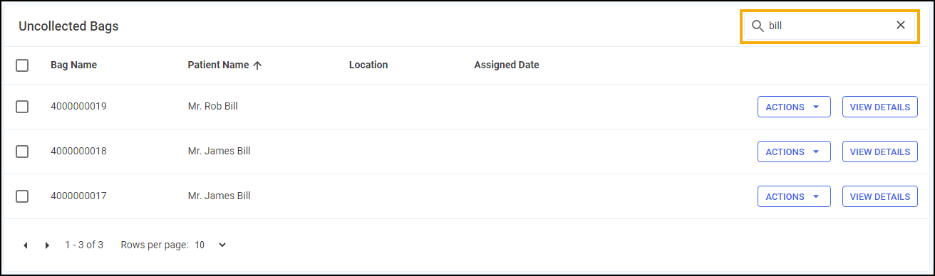 2. The Bag Details screen displays for the patient, with each bags listed and, if assigned, their location. Locate all bags listed if more than one.