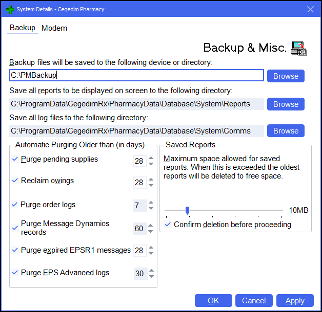 By default, Pharmacy Manager keeps the ten most recent backups before the oldest backup is removed, thus always maintaining the ten most recent.