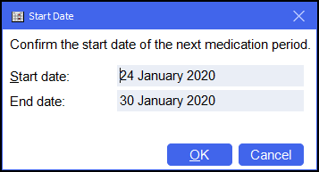 - In Start date, enter a date for the first medication period. The default is for tomorrows date and reflects the weekly/four weekly cycle from Weeks to supply.