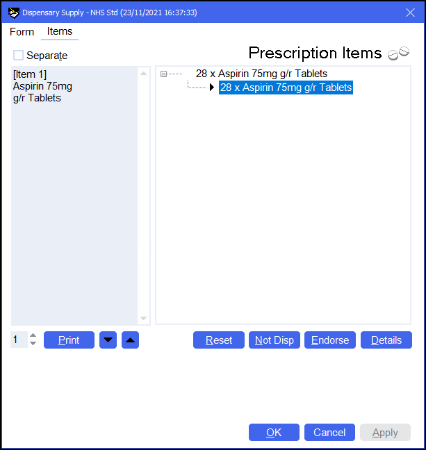 - The Dispensary Supply screen displays where you can endorse the prescription in the usual way.
