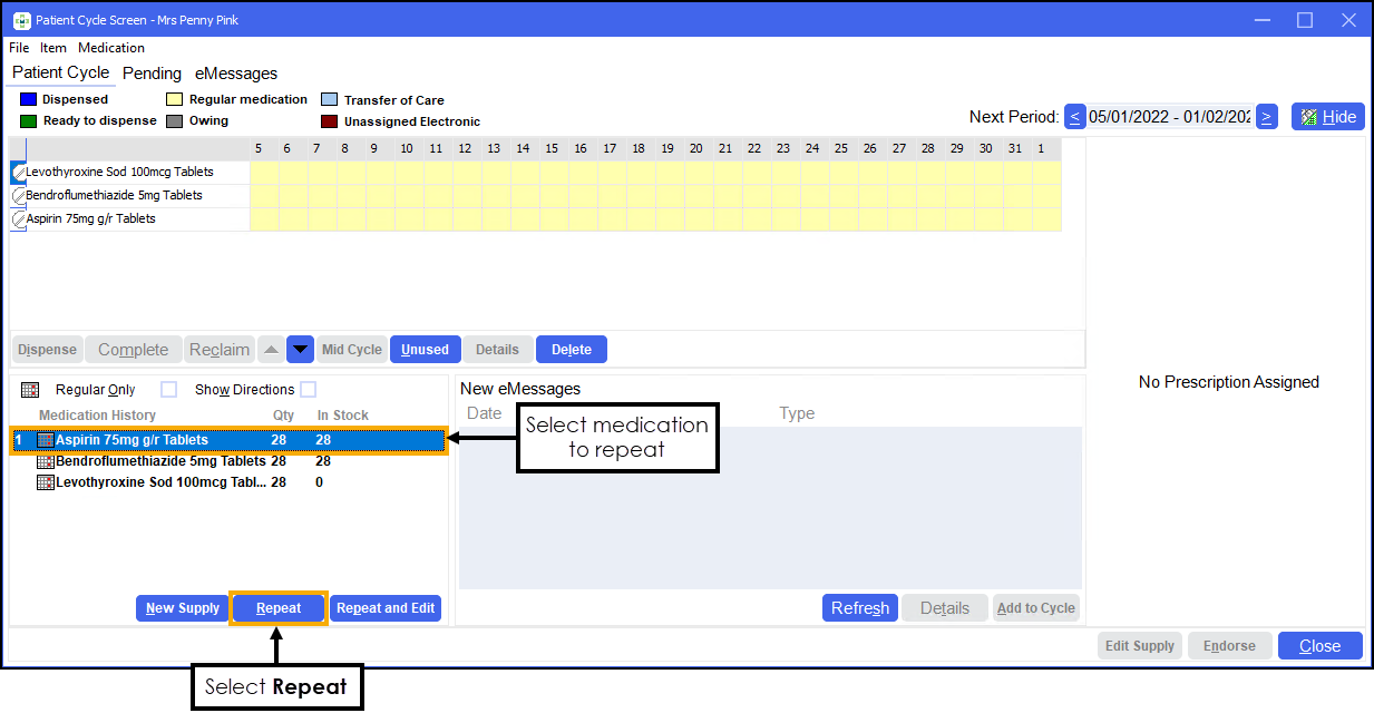 If a medication item has been previously dispensed to a patient the item displays in the patient’s Medication History, where you can dispense a repeat of the same medication item.