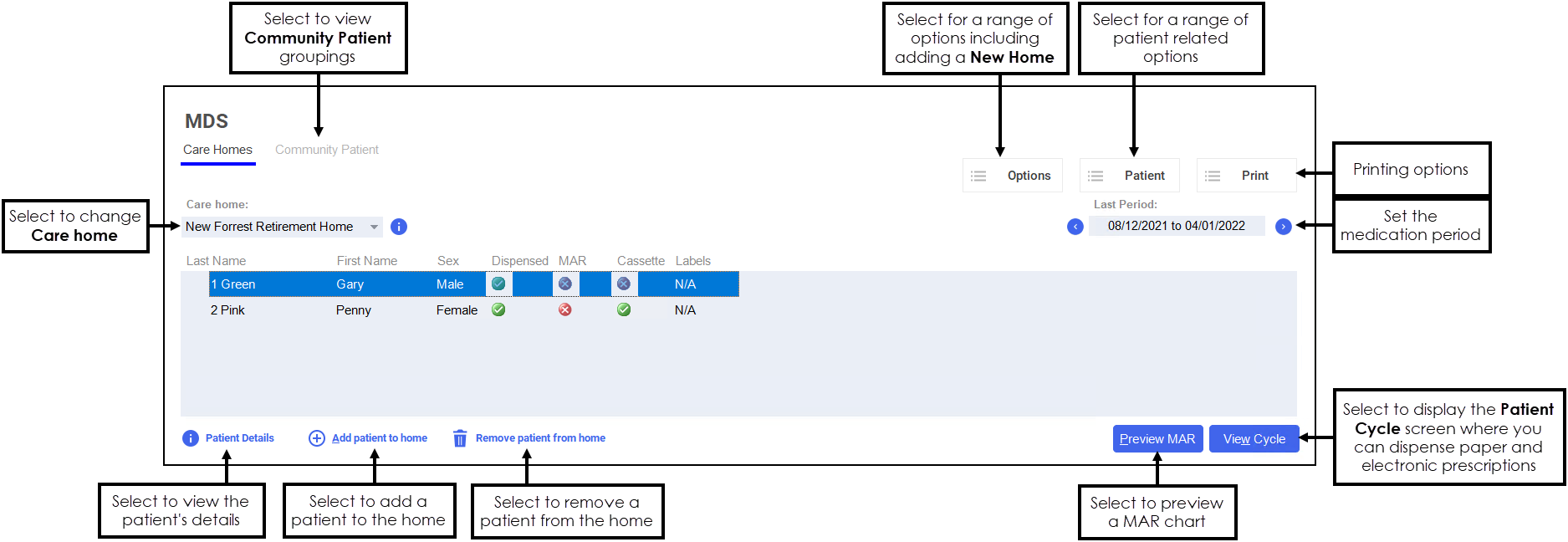 Important - Before you can dispense using the MDS screen, you must set up your patients and Nursing Homes, see Adding a new patient to a care home, Adding a Nursing Home, Adding a Community Patient.