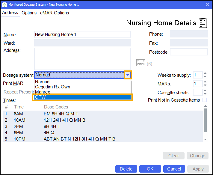 From the Nursing Home Details screen, select CPW from Dosage system: